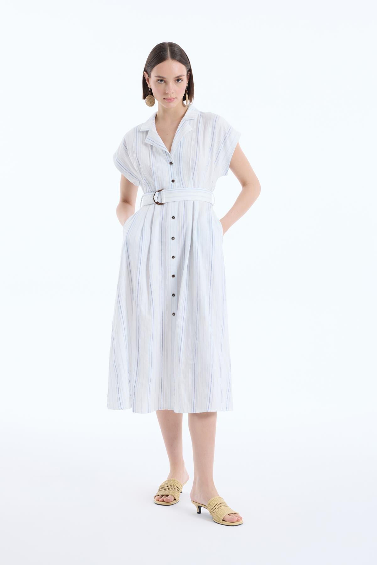 Çizgi Detaylı Elbise Ekru